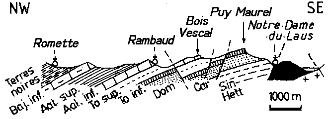 ![]() Coupe de la partie nord-ouest du Dôme de Remollon La "faille de Rambaud" (f.Ra sur la carte), passe immédiatement au sud-est du village : orientée presque parallélement aux cuestas, cette faille extensive provoque, dans le paysage, le redoublement de la cuesta de l'Aalénien. |