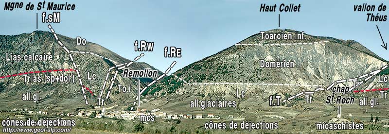 ![]() La rive droite de la Durance à Remollon vue du sud, depuis les environs de Rochebrune. La partie visible sur la photo correspond à la partie centrale de la coupe ci-dessus. f.sM = faille extensive de la montagne Saint-Maurice ; f.RW et f.RE = failles occidentale et orientale de Remollon : ces deux cassures limitent un panneau de Toarcien effondré qui représente le prolongement méridional du graben de Saint-Étienne-le-Laus. f.T = faille de Théus : cette cassure extensive est fort peu pentée ; elle doit se prolonger vers la gauche et passer juste en amont du village, sous les alluvions glaciaires qui tapissent les pieds d'escarpements. En effet il n'y a pas assez de place à cet endroit pour loger en totalité l'épaisse succession du Lias calcaire entre la base du Domérien et l'affleurement de cristallin de Remollon (mcs). |