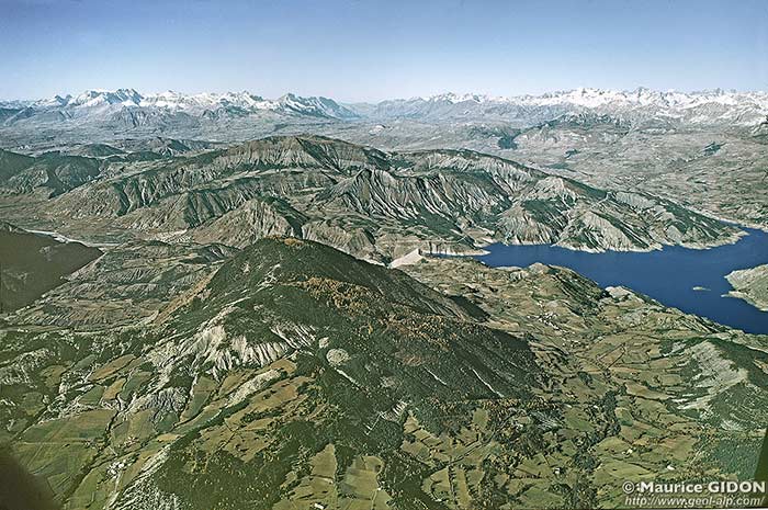 En avant-plan au sud de la vallée de la Durance et de la retenue de Serre Ponçon, le dôme de Remollon (vu "de dos") plonge doucement vers le sud, pour s'ennoyer sous les Terres Noires au sud de Seyne-les-Alpes.