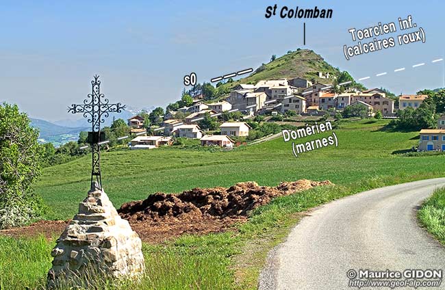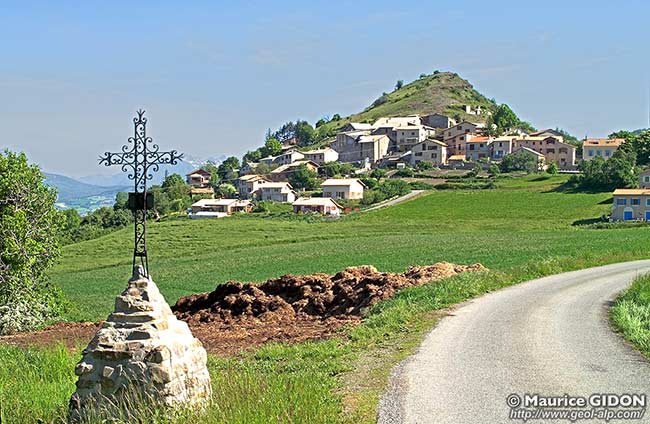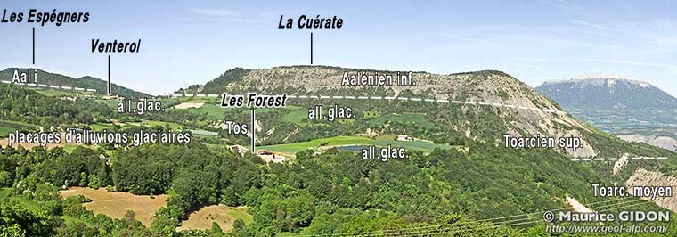 La situation altitudinaire des principaux villages du versant NE de la montagne des Pluis y semble avant tout déterminée par le fait qu'elle correspond au niveau supérieur atteint par le glacier wurmien de la Durance : ce dernier y a créé une série d'épaulements rocheux armés par les niveaux les plus calcaires (essentiellement les calcaires argileux de l'Aalénien inférieur), et abandonné des alluvions morainiques qui y ont garni une ligne de replats cultivables.