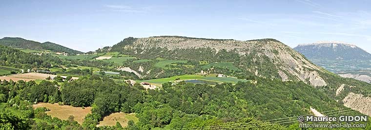 Enfin la partie sommitale de la montagne des Pluis est formée par les couches du Jurassique moyen, qui y sont presque horizontales ; celles du Bajocien y forment même deux chapeaux isolés (Serre Brouchon et Montsérieux) qui coiffent la crête à la façon de buttes témoins. En fait ces couches ne viennent pas dans le prolongement direct des pentes qui en descendent vers le bas (voir le cliché en haut de la page) : elles sont abaissées par rapport à ces dernières par la faille de Piégut, orientée WSW - ENE, qui court parallèlement à la crête, un peu au dessus du niveau des replats portant les villages.