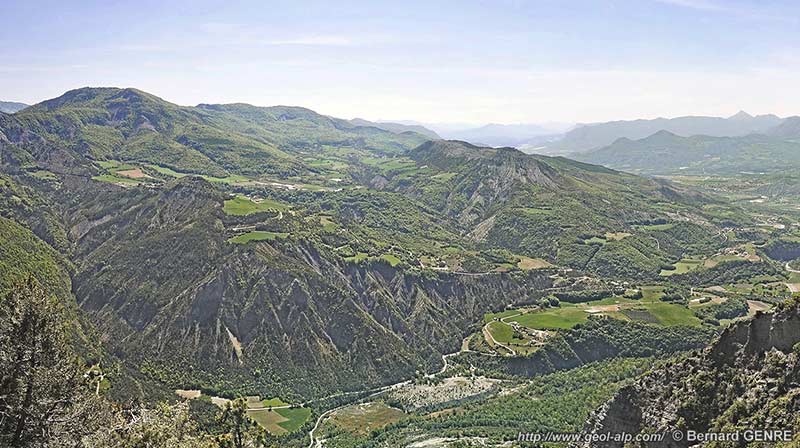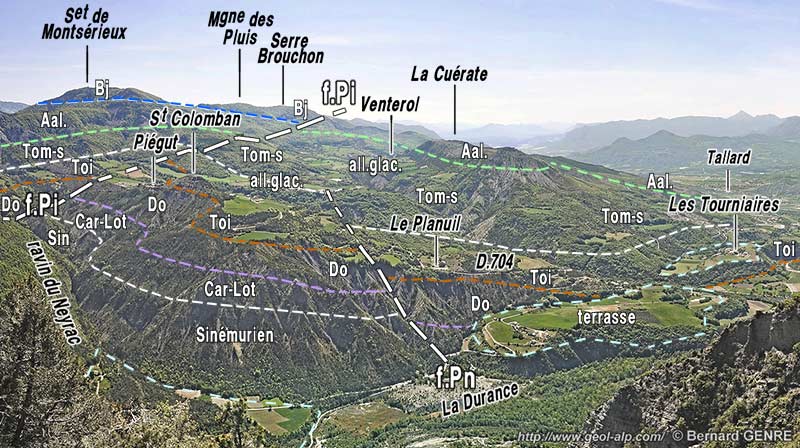 Or on se trouve ici dans le flanc sud-oriental du vaste synclinal de Tallard, dont l'axe se relève doucement, à cette latitude, en direction de la voûte du Dôme de Remollon, ceci avec un pendage des couches grossièrement dirigé vers le nord-ouest. De ce fait à l'est de l'inflexion des Tourniaires (pentes de Piégut) la vallée coupe les strates presque orthogonalement et l'érosion y a dégagé plusieurs lignes de cuesta qui descendent obliquement vers le lit de la rivière.