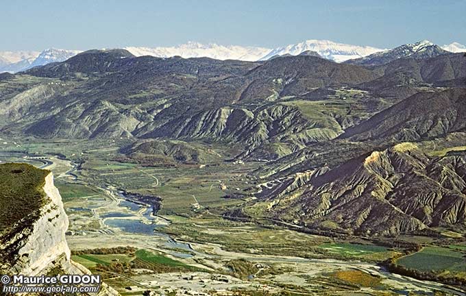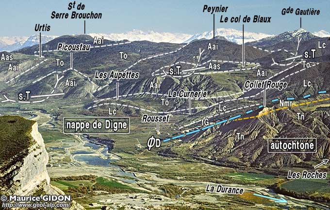 ![]() Les pentes de rive gauche de la Durance aux abords du Rousset, vues de la montagne de Crigne (rive droite de la Durance). ØD = surface de chevauchement de la nappe de Digne ; s.T = synclinal de Tallard : observer comment son axe, plongeant vers le nord (vers la gauche) traverse le versant en diagonale. N.B. : le Serre Brouchon, sommet occidental de la montagne des Pluis, est couronné par le Bajocien. >> noter les trois chevrons d'Urtis, de Picousteau et de Peynier, tous pointant vers la droite et armés par la barre de l'Aalénien inférieur (commentaires complémentaires à la page "Rousset"). |