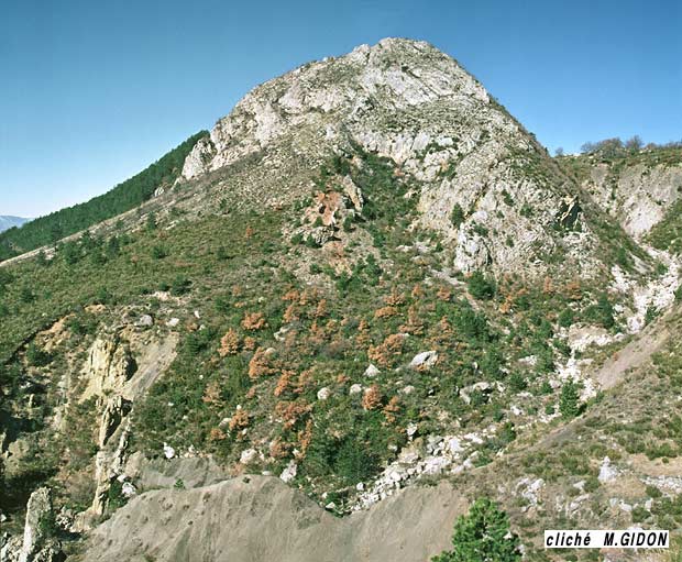 En outre le coeur de Bajocien de l'anticlinal des Naux est perçé, dans ce secteur précis, par une masse lenticulaire de gypses triasiques, allongée également de 3 kilomètres d'ouest en est. Il s'agit d'un diapir* et celui-ci s'est mis en place avant le dépôt des couches tertiaires car ces dernières reposent par places directement sur le gypse et en cachètent* les contacts avec les terrains plus récents.