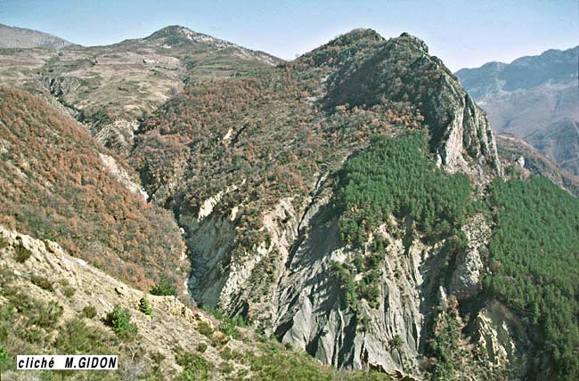 En direction du nord-est les terrains crétacés du flanc sud de l'anticlinal des Naux disparaissent à tour de rôle, depuis les plus récents (Hauterivien - Barrémien) jusqu'au Tithonique, en s'enfonçant sous la Molasse Rouge oligocène du bord nord-occidental du bassin tertiaire de Digne-Valensole.