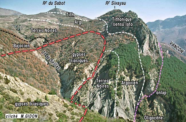 À la latitude des Naux les couches oligocènes du bord du bassin tertiaire de Digne s'appuient directement sur l'Argovien ou les Terres Noires du flanc oriental de l'anticlinal des Naux. La barre tithonique s'interrompt sur plus de 3 kilomètres d'ouest en est, entre le Rocher Sivayau au NE et l'extrémité orientale des Rochers de Saint-Michel (rocher coté 1030).