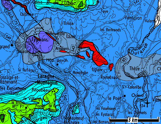 Comme il est classique dans ce genre de structures (phénomène de l'"extravasion")* le gypse déborde sur ses bordures dont les couches sont rebroussées (ce qui fait apparaître les bancs marno-calcaires des Terres Noires du Bajocien supérieur à sa périphérie nord-ouest). La zône où le gypse est venu percer jusqu'à la surface du sol se situe sur l'axe de l'anticlinal de Sigoyer mais elle ne coïncide avec le passage d'aucune cassure notable : il s'agit donc d'un pli-diapir typique.