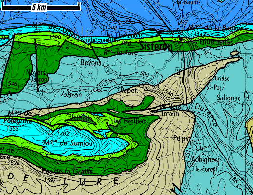 Au sud de Sisteron on pénètre à l'opposé dans une zone synclinoriale dont le coeur est occupé par le Tertiaire du bassin de Valensole (l'extrémité orientale de l'anticlinal de Lure s'y amortit en rive droite de la Durance avant que ses couches d'âge secondaire ne s'enfoncent, en rive gauche, sous les terrains tertiaires) (voir la carte en fin de page). Le pli le plus septentrional de ce domaine est le synclinal du Jabron qui sépare en définitive la montagne de Lure (voir la page "Lure") de l'anticlinorium de Laragne.