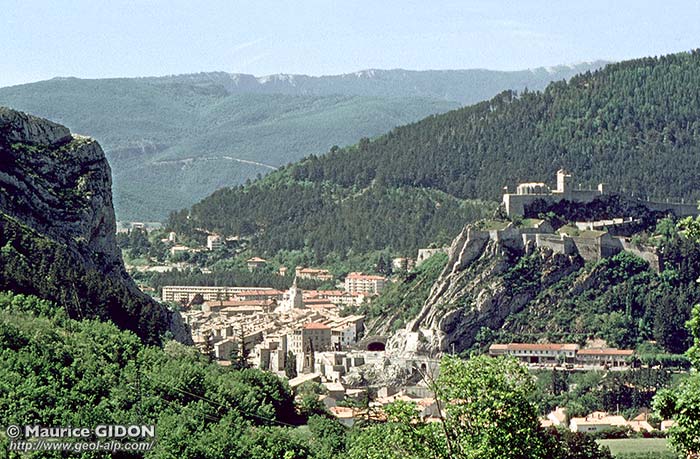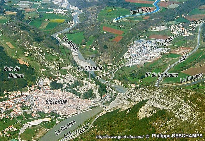 ![]() Le site de Sisteron, vu du SE, d'avion (cliché original obligeamment communiqué par Mr. P. Deschamps) |