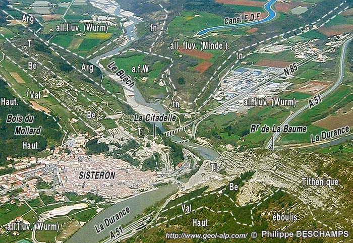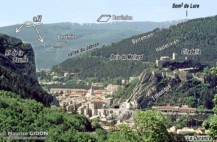 ![]() Sisteron et sa citadelle vus du NE C'est sur la tranche, arasée, des bancs du Tithonique qu'est construite la citadelle. Ils sont sub-verticaux et d'une quasi-planéité. a.V = anticlinal de Valbelle : la voûte de Barrémien de ce pli plonge doucement vers l'est. Elle est dénudée par l'érosion à gauche mais à droite du symbole de charnière elle a été décapitée par l'érosion, ce qui a mis en relief le crêt de la montagne de Lure ; son flanc nord est constitué par la dalle calcaire du Barrémien qui plonge doucement vers l'observateur pour se faire trancher par la vallée du Jabron (voir la page "Lure"). (des petits schémas cherchent à représenter, dans l'espace, la disposition opposée des couches de l'un et l'autre flanc). |