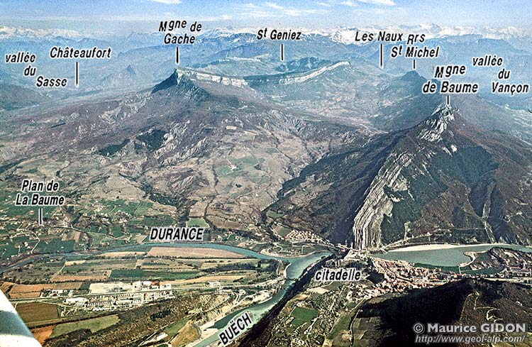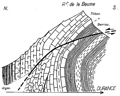 En rive gauche de la Durance l'éperon rocheux de la Baume, symétrique de celui de la Citadelle, dessine par contre vers le haut une inflexion antiforme fait pendre vers le nord les couches de la crête de la montagne. D'autre part l'examen de détail y révèle, au sein de la barre tithonique, des torsions et des ruptures de couches.