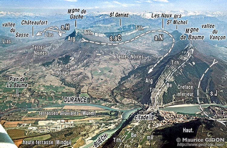 ![]() Le site de Sisteron : vue plongeante d'avion, d'ouest en est. La barre tithonique verticale de la "clue" de la Durance appartient au flanc nord du synclinal du Jabron (s.J). Elle se renverse vers le sud, plus haut dans le versant puis se raccorde au flanc sud de l'anticlinal des Naux (a.N), dont la charnière plonge vers l'est peu avant le secteur de Saint-Geniez (voir la page "Saint-Geniez"). À gauche de la dépression de Terres Noires ouverte dans le coeur de ce dernier pli, la Montagne de Gache représente le rebord occidental du synclinal d'Aigues-Champ (s.aC), pli auquel fait suite du côté nord l'anticlinal de Hongrie (a.H) à cœur de Lias. À l'arrière-plan les crêtes enneigées, au delà de Saint-Geniez, appartiennent à la nappe de Digne. |