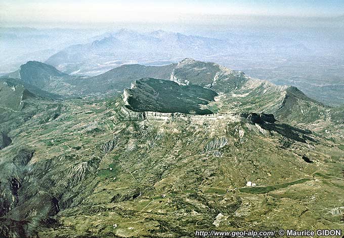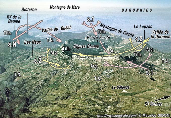 En fait, tous les anticlinaux de ce secteur ayant été érodés jusqu'au niveau des Terres Noires, la corniche tithonique s'incurve encore plus à l'ouest, en ceinturant une cuvette structurale, presque circulaire. Cette cuvette d'Aigues-Champ est plus précisément dûe à l'entrecroisement de deux synclinaux dont les axes sont orientés presque à 90° l'un de l'autre (cliché ci-après). La ceinture tithonique de cette dépression est toutefois percée par le Jabron à son extrémité est, près de Saint-Geniez et à son extrémité ouest par le défilé de Pierre Écrite. Néanmoins cette cuvette, ainsi isolée par l'érosion, constitue un bel exemple de "synclinal perché"* certes peu saillant mais bien caractérisé.