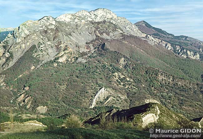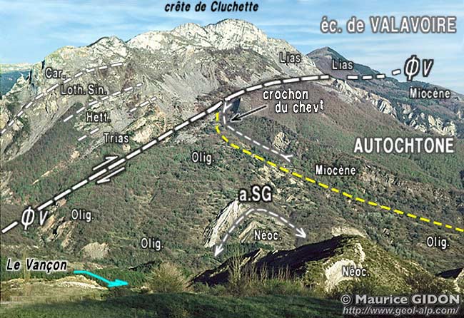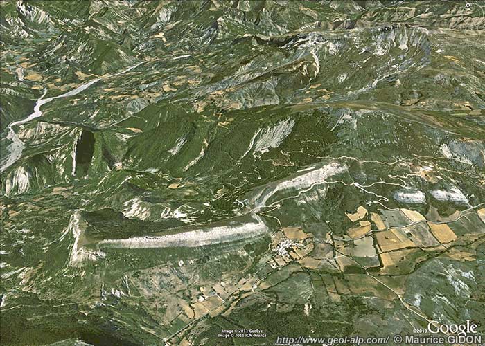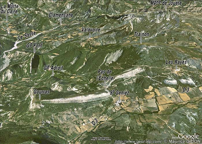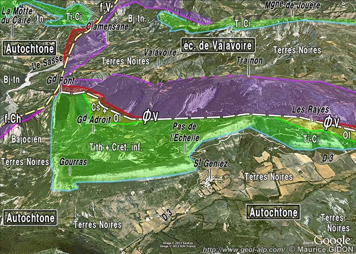 ![]() d'après une image extraite de "google-earth" / Les environs septentrionaux de Saint-Geniez, vus du sud-ouest (à peu près de l'aplomb des Naux). f.Ch = faille de Châteaufort ; f.V = faille de Vermeil ; ØV = chevauchement de l'écaille de Valavoire. |