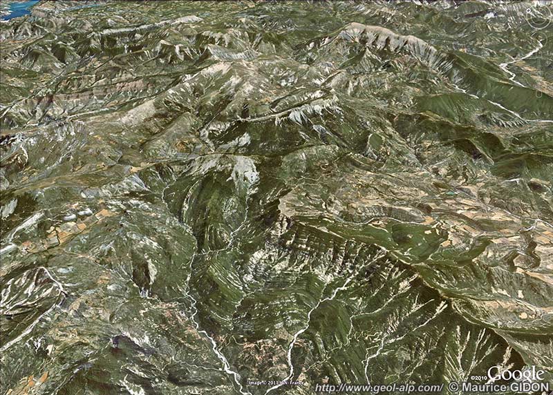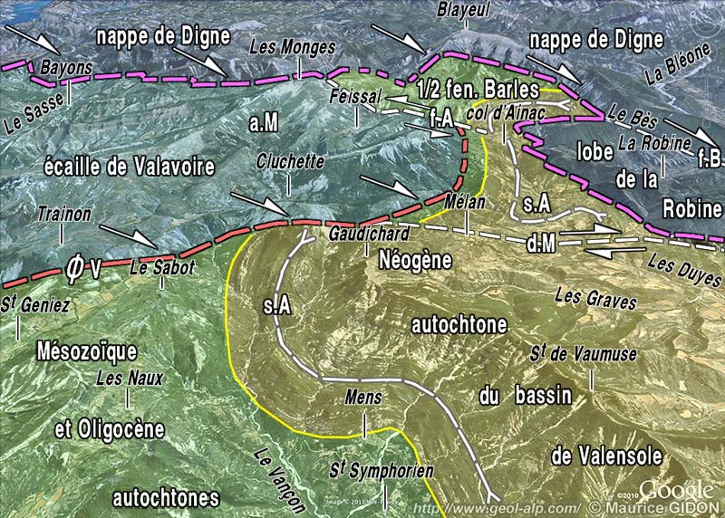 ![]() d'après une image extraite de "google-earth" Le vallon du Vançon, vu d'enfilade, depuis le sud-ouest, dans son contexte régional s.A = synclinal d'Auribeau et du Haut Vançon ; ØV = chevauchement de Valavoire ; d.M = décrochement deMélan ; f.A = faille d'Ainac (= accident des Monges) ; f.B = faille du Bès. Les demi-flèches indiquent le sens relatif du compartiment sur lequel elles sont placées, par rapport à celui qui lui est juxtaposé. |