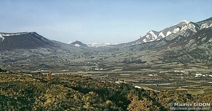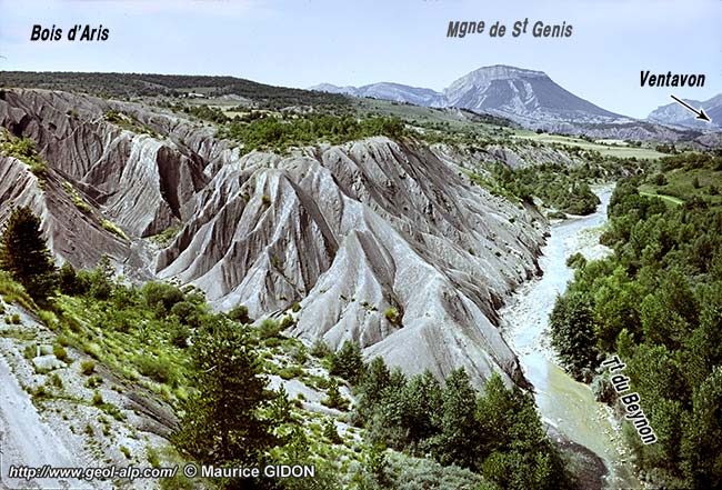 ![]() La rive droite du ravin du Beynon, au sud de Ventavon. Tout le substratum rocheux est formé de Terres Noires à peine recouvertes d'une pellicule d'alluvions quaternaires. |