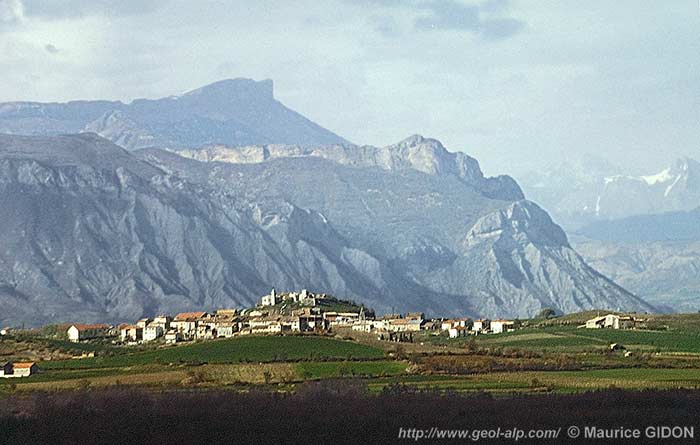 ![]() Le village de Ventavon vu du sud (en arrière-plan la crête des Selles et la falaise de Céüse). |