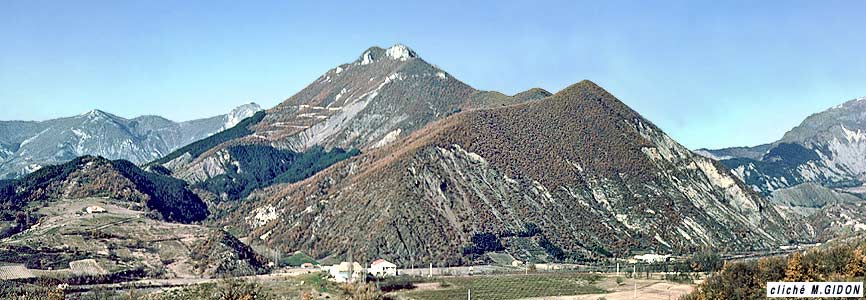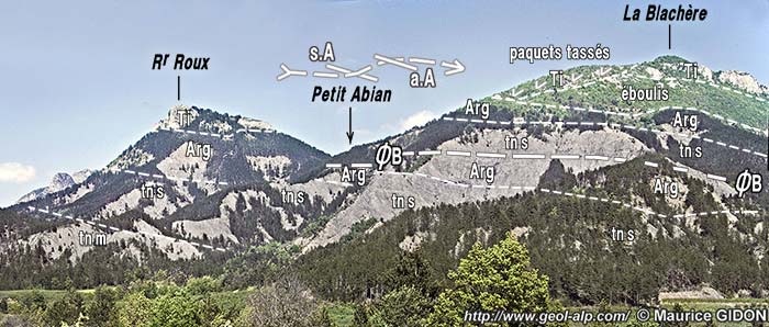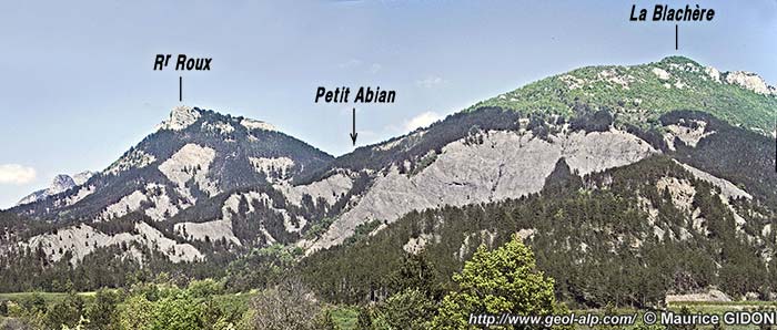 a/ Le sommet de La Blachère est couronné par un chapeau de couches tithoniques presque horizontales, coiffées par un peu de Berriasien. Il constitue une sorte de "butte-témoin* séparée de celle plus septentrionale du Petit Roux par une entaille d'érosion oblique à la crête qui emprunte le passage d'une ondulation anticlinale des couches : celle-ci se poursuit vers le NE, en s'accentuant, au flanc sud-oriental de la crête menant au sommet du Jalinier, qui est ainsi parcouru àmi pente par un synclinal d'Abian (voir la page "La Motte-du-Caire" et le second cliché ci-après).