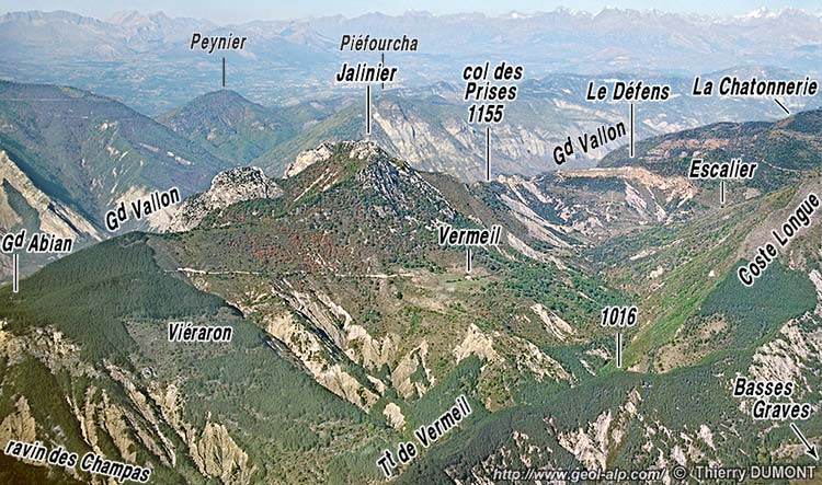 Sur son versant occidental il est entaillé de ravines qui montrent dans leurs escarpements le passage d'une faille compressive qui redouble la succession des Terres Noires et de l'Argovien. son tracé s'abaisse vers le sud, jusqu'au hameau de Rouast où le Torrent du Grand Vallon se jette dans le Sasse .
