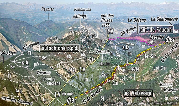 Du côté oriental tous ces affleurements, globalement peu pentés, sont tranchés par le tracé de la faille de Vermeil. Celui-ci s'abaisse progressivement vers le sud depuis le col 1155 du Rocher des Prises (voir la page "Le Caire") en traversant les pentes orientales du Barrican, puis du Jalinier : elle dissocie clairement, à l'ouest l'autochtone proprement dit, doté de Tithonique et de Crétacé inférieur, et du côté est l'autochtone des écailles de Faucon, où les molasses rouges oligocène reposent directement sur les Terres Noires : la différence entre ces deux domaines est telle qu'elle implique qu'ils aient été rapprochés par un jeu important de la faille.