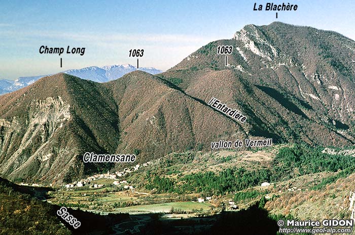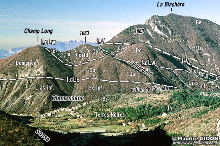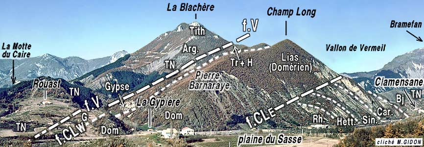 B/ Immédiatement à l'ouest de Clamensane l'échine de Champ Long est représentative la succession liasique de l'écaille de Valavoire. Cette succession est coupée en biseau par la bordure de la plaine alluviale du Sasse, selon une coupe oblique aux couches qui montre que cette succession pend vers l'est de façon globalement monoclinale. Elle est en outre affectée par la faille orientale de Champ Long qui traverse le versant en biais parallèlement à la crête et qui est dotée d'un pendage plutôt faible vers l'ouest ainsi que d'un rejet extensif d'abaissement de sa lèvre occidentale. Cette attitude dénote déjà un accident plus ancien que le basculement qui a donné aux couches leur attitude actuelle (laquelle correspond au flanc ouest du synclinal de Reynier).