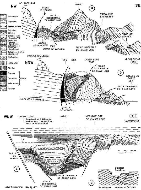 La faille orientale de Champ Long, qui limite le graben du côté est, représente sans doute, quant à elle, une faille secondaire « compensatrice* », induite par la forme courbe (listrique) probable de surface de la faille majeure de Vermeil (schéma d). (extrait de la publication n° 075).