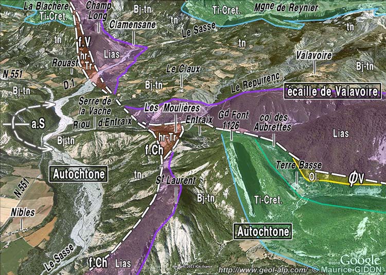 f.V = faille de Vermeil ; f.H = faille de Hongrie ; ØV = chevauchement de l'écaille de Valavoire ; a.S = anticlinal de Sigoyer.