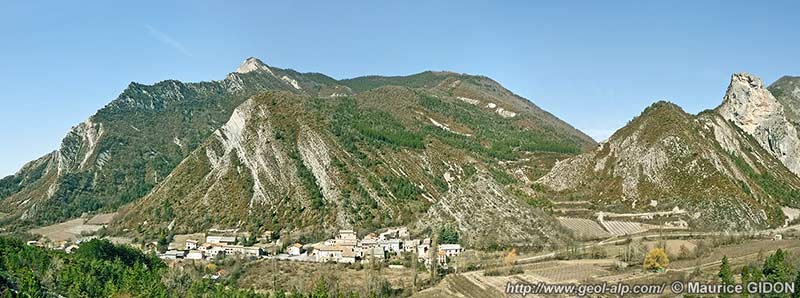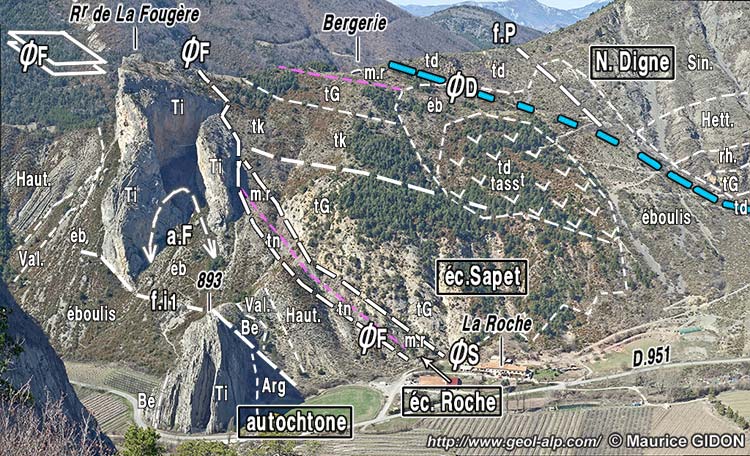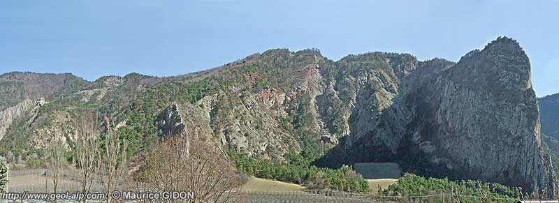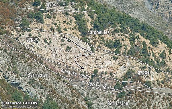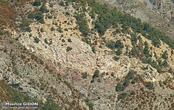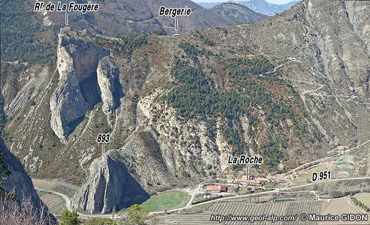 - La rive droite (La Roche) donne une coupe orthogonale à ce débitage en lames imbriquées qui affecte le substratum de la nappe, qu'il appartienne à l'autochtone du Caire (Jurassique supérieur et Crétacé inférieur) ou au matériel constitutif des écailles de Faucon (Terres Noires et Oligocène). C'est en effet à ce dernier ensemble (plus précisément à l'écaille du Sapet) qu'il faut sans doute rattacher la masse triasique des pentes de La Roche, car elle est coiffée par un chapeau de conglomérats et molasses rouges oligocènes.