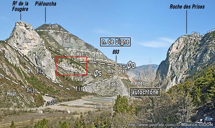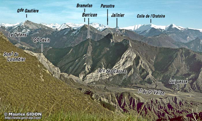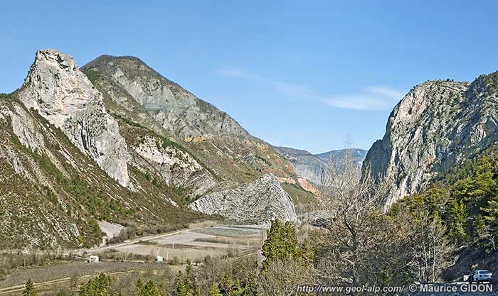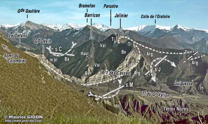 En amont de La Motte-du-Caire le torrent du Grand Vallon franchit orthogonalement la bordure tithonique du sillon des Terres Noires que forment les falaises des Rochers des Casses en rive gauche et du Grand Dévin en rive droite, cette dernière représentant la terminaison orientale de la barre qui arme la crête de la Montagne de Melve (voir la page "Melve"). Plus précisément cela se produit au plus creux du large synclinal W-E de Melve, pli qui s'intercale entre l'anticlinal des Chanderettes, en rive droite du Grand Vallon, et l'anticlinal du Jalinier, en rive gauche (voir la page "La Motte-du-Caire").