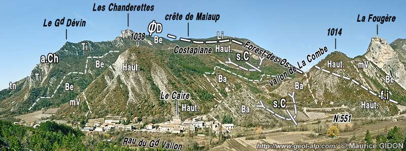 Ce synclinal du Caire est donc transverse aux plis d'axe W-E, notamment à celui des Chanderettes, qu'il intersecte à l'ouest du village du Caire : de ce fait les axes de ces plis, ainsi que leur voûte tithonique (plus ou moins dégagée par l'érosion) sont fortement basculés vers l'est. C'est pourquoi, de l'aval vers l'amont jusqu'au village du Caire, les pendages sont tous dirigés vers l'est (à des nuances d'azimut près). C'est aussi pourquoi, si l'on remonte en direction du nord le vallon de la Combe, on traverse la succession des couches de plus en plus récentes de Crétacé inférieur et pour finir on atteint la surface de chevauchement de la nappe de Digne.