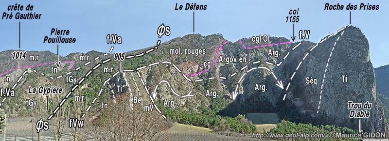 - La rive gauche (La Gypière) montre un dispositif sensiblement différent (et plus complexe à interpréter), où les imbrications de chevauchements jouent un rôle moins prévalant. Néanmoins il est clair que c'est le matériel nummulitique du Défens qui prolonge celui de l'écaille de La Roche, puisqu'ils sont l'un comme l'autre chevauchés par les gypses rapportés à l'écaille du Sapet (voir la page "Roche Cline").