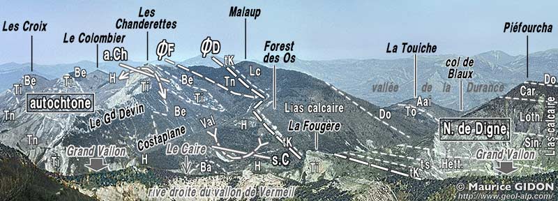 ![]() Le versant méridional de la montagne de Malaup, vu du SE, par dessus la crête de rive droite du vallon de Vermeil, depuis le sommet de la Postelle (l'avant-plan de ce cliché - ici supprimé - est visible à la page Vermeil). ØF = surface chevauchement de l'"écaille" de Fleurans (voir la page "La Saulce") ; ØD = surface de chevauchement de la nappe de Digne ; a.Ch = anticlinal des Chanderettes ; s.C = synclinal du Caire. |