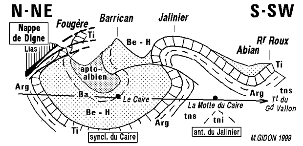 ![]() Coupe selon la rive gauche (sud-orientale) du Grand Vallon, au NE de La-Motte-du-Caire. Du fait de son orientation oblique aux plis cette coupe traverse successivement un synclinal NW-SE (celui du Caire) et un anticlinal W-E (celui du Jalinier). N.B. : La localité de La Motte-du-Caire est indiquée dans la position structurale qui est la sienne, mais elle ne se trouve pas sur le tracé exact de la coupe (lequel passe près de 2 km plus à l'est) : voir la carte schématique en fin de page. |