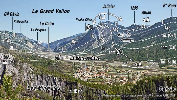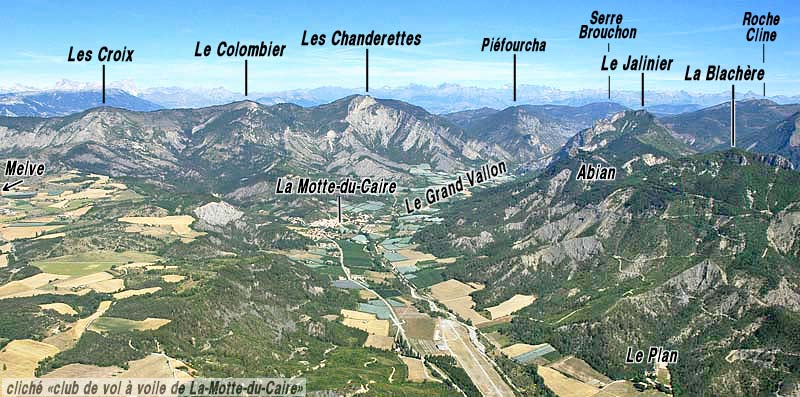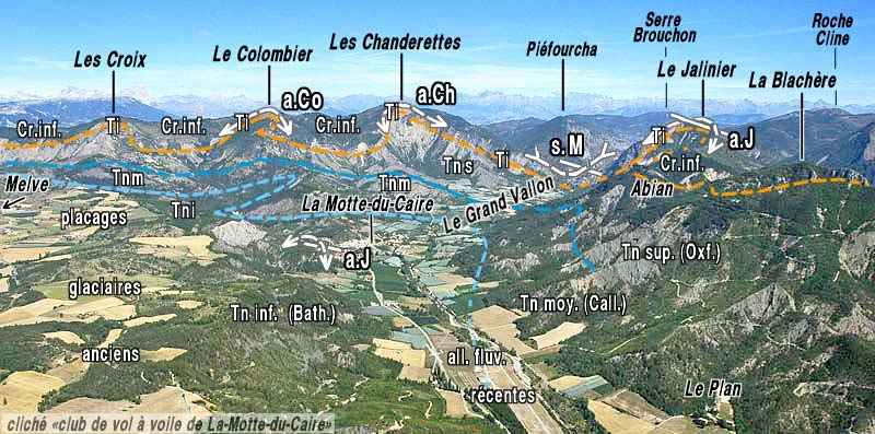 ![]() Les environs de La-Motte-du-Caire, vus du sud, d'avion, depuis l'aplomb du Bois d'Aubert (cliché emprunté au site du Club de Vol à Voile de La-Motte-du-Caire : http://cvvmc.free.fr/). En arrière de La Motte le rebord d'érosion qui ferme la dépression de Laragne est armé par le Tithonique. Celui-ci dessine 3 anticlinaux successifs dont les axes, obliques à ce rebord, sont orientés SW-NE. a.Co = anticlinal du Colombier ; a.Ch = anticlinal des Chanderettes (voir plus de détails en fin de page) ; s.M = synclinal de Melve ; a.J = anticlinal du Jalinier ; Cr. inf. = Crétacé inférieur (Berriasien, Valanginien, Hauterivien) ; Tni = Terres Noires supérieures (Oxfordien) ; Tnm = Terres Noires moyennes (Callovien) ; Tni = Terres Noires inférieures (Bathonien). |