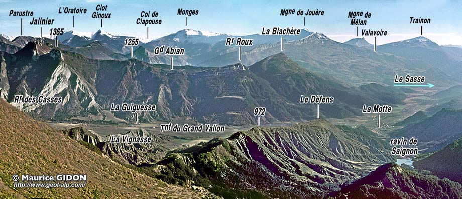 B/ Au sud-est de La Motte, le Grand vallon change d'aspect en s'élargissant et modifiant son orientation : elle passe de NE-SW à N-S, suivant alors la combe des Terres Noires supérieures qui marque la périphérie orientale de l'anticlinorium de Laragne.