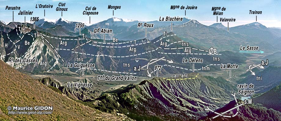 ![]() La vallée de La-Motte-du-Caire et son confluent avec celle du Sasse vue du nord, depuis le sommet des Croix (crête de La Montagne). À l'arrière plan se profile la partie méridionale de l'écaille de Valavoire. La montagne de Jouère est formée par la corniche Tithonique de cette unité : elle dessine, de façon très visible sous cet angle, le bord sud de la cuvette de Reynier (dont l'intérieur apparaît comme des pentes neigeuses envahies par l'ombre, en avant des Monges). Plis presque E-W : s.M = synclinal de Melve ; a.J = anticlinal du Jalinier ; ØB = chevauchement de La Blachère. Tous ce plis ont leurs axes qui s'élèvent vers l'ouest, au flanc est du bombement N-S de l'anticlinorium de Laragne. |