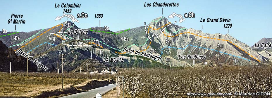 A/ Du côté septentrional la dépression de la Motte-du-Caire est limitée par le prolongement oriental de la Montagne de Melve à l'est du sommet des Croix. Sur cette crête la barre tithonique affleure en deux points, correspondant aux endroits où elle est traversée par deux anticlinaux successifs, celui du Colombier et celui des Chanderettes. L'un comme l'autre ont leur axe orienté NE-SW, ce qui leur ne leur donne qu'une faible obliquité par rapport à la crête, simplement plus E-W. Ils montrent également un déversement vers le sud qui est caractérisé par la rupture de leur flanc sud, qui chevauche légèrement dans cette direction.