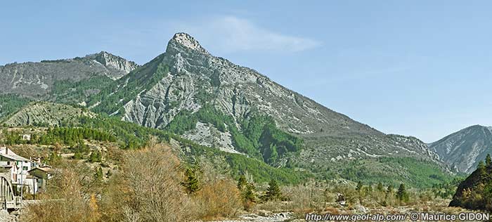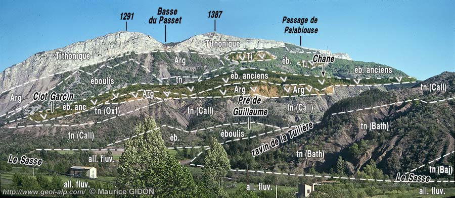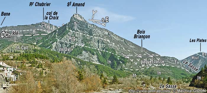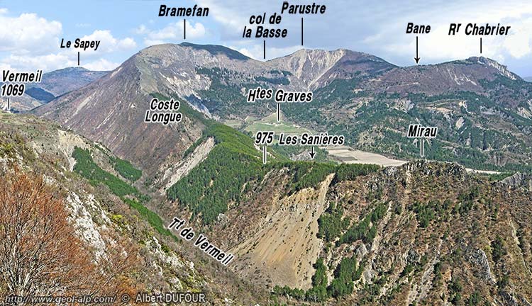 Par ailleurs la coupe naturelle de l'entaille du torrent de Vermeil montre que, depuis Clamensane par la crête de Mirau et celle de Coste Longue jusqu'au sommet de Bramefan. les Terres Noires et les calcaires lités du Dogger reposent de façon normale (stratigraphique), bien qu'en discordance sur le Lias à pendage vers le sud-est qui ferme cette dépression du côté occidental.