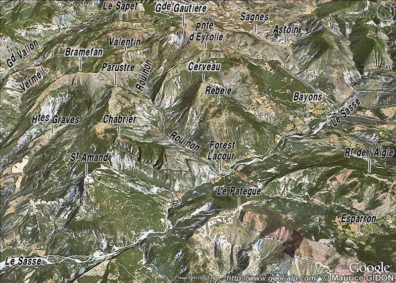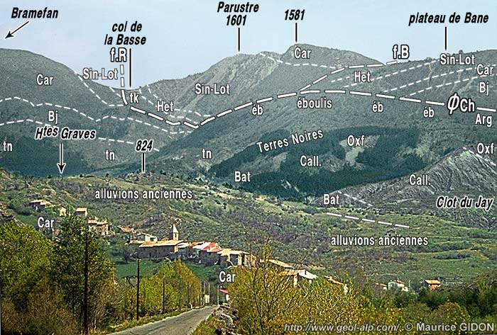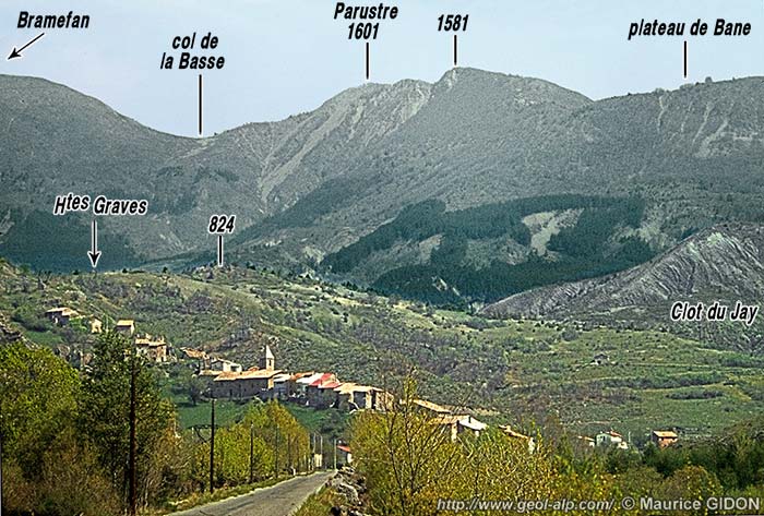 Cependant la limite supérieure d'extension des affleurements de ces Terres Noires se referme vers le nord en suivant le pied des crêtes, selon un dessin en fer à cheval enserrant le hameau des Graves. C'est-à-dire qu'elles occupent le cœur d'une cuvette ouverte vers le sud mais fermée du côté nord par la bande de calcaires d'âge plus ancien qui arme la crête de Bramefan, du Parustre et du Rocher Chabrier.