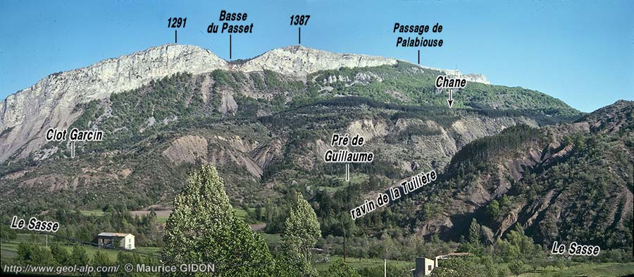 En rive gauche du Sasse le Tithonique du flanc SW du synclinal d'Esparron forme la belle falaise qui s'efface passagèrement au Passage de Palabiouse et au revers de laquelle est installé le village de Reynier. À son pied le versant a pour soubassement, comme sur l'autre rive, la succession des divers niveaux que l'on peut distinguer dans les Terres Noires. Mais ces couches sont largement masquées par de larges épandages d'éboulis anciens wurmiens qui ont sans doute garni ce versant parce qu'ils on glissé sur son substratum marneux. Ils sont le plus souvent riches en gros blocs de Tithonique et résultent donc d'éboulements successifs de la falaise ou de la dislocation d'anciens paquets tassés en provenant.