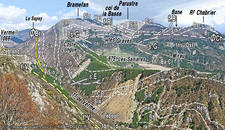 ![]() Les crêtes de rive gauche du vallon de Vermeil, vues du SW, depuis Petit Abian (cliché original obligeamment communiqué par Mr. A. Dufour). f.V = faille de Vermeil ; ØBr = chevauchement de Bramefan (branche orientale de la faille de Vermeil ?) ; f.R = faille de Rouinon ; f.B = faille de Bane ; ØCh : chevauchement du Roc Chabrier. s.G = crochon synclinal des Graves, induit par le jeu (dextre) de la faille de Rouinon ; s.E = synclinal d'Esparron. "Ba-C" = Bathonien - Callovien ; "Oxf" = Oxfordien inférieur (voir la colonne stratigraphique). |