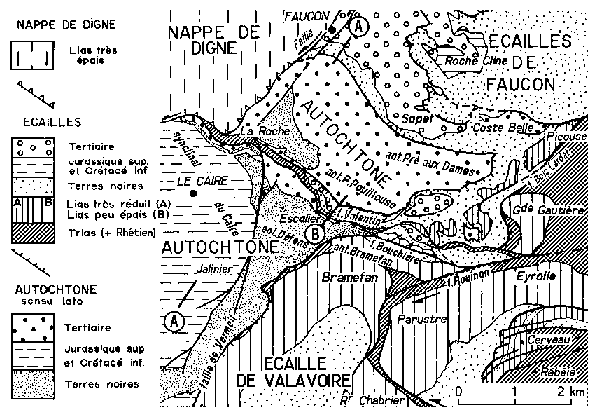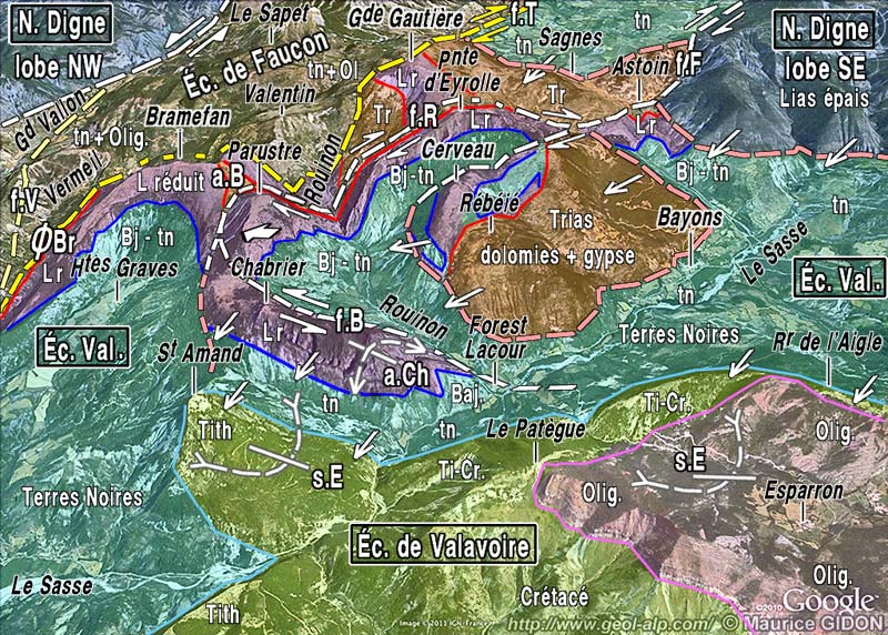 Les failles de coulissement (à fort pendage) sont figurées en blanc ; on a figuré en rose les surfaces de recouvrement tectonique, faiblement pentées (chevauchement du lobe sud-oriental de la nappe de Digne et de la klippe du Cerveau, enfoncement du lobe médian ("de Bréziers") de la nappe sous le Trias de Gautière (= faille des Sagnes).