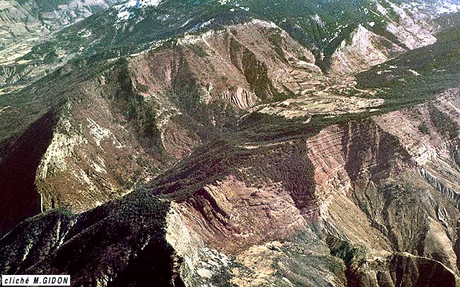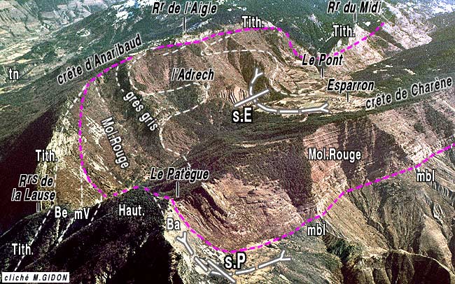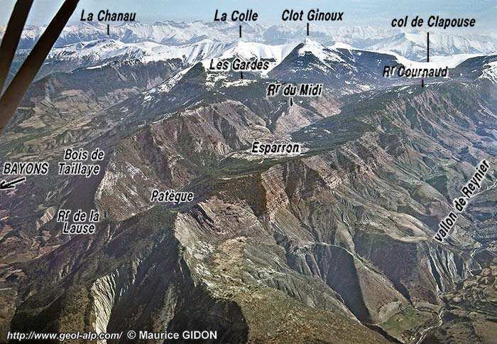 ![]() d'après une image extraite de "google-earth" Le cours supérieur du Sasse en amont de Clamensane et les montagnes du massif de la Grande Gautière, vus du sud. s.E = synclinal d'Esclangon ; a.B = anticlinal du Bramefan ; a.Ch = anticlinal du Château et de Chabrier (prolongement décalé vers le sud du précédent). f.V = faille de Vermeil ; f.T = faille de Turriers ; f.R = faille de Rouinon ; f.F = faille de la Frayssinie ; f.B = faille de Bane. Les failles de coulissement (à fort pendage) sont figurées en blanc ; on a figuré en rose les surfaces de recouvrement tectonique, faiblement pentées (chevauchement du lobe sud-oriental de la nappe de Digne et de la klippe du Cerveau, enfoncement du lobe médian ("de Bréziers") de la nappe sous le Trias de Gautière (= faille des Sagnes). La grosse flèche, au dessus du mot "Chabrier" indique le mouvement de la pointe du poinçon induit par l'avancée (vers l'ouest) de la klippe du Cerveau ; les autres flèches indiquent le sens du mouvement des cassures (coulissantes ou chevauchantes). Le tracé jaune correspond à l'alignement des cassures (failles de Vermeil, de Bois Lardat, de Picouse et de Turriers) qui jalonnent le tracé du linéament de Clamensane : le compartiment situé au nord-ouest de ce tracé a une structure dominée par le système des écailles de Faucon : elle est très étrangère à celle du versant de Bayons, appartenant à la grande "écaille de Valavoire", où prédominent les déformations associées au charriage de la nappe de Digne. |
