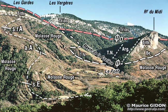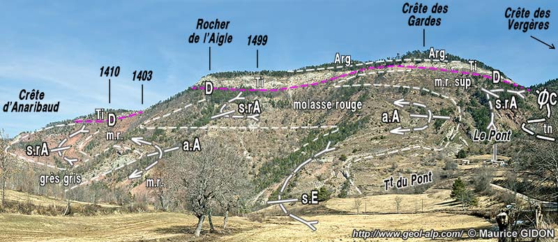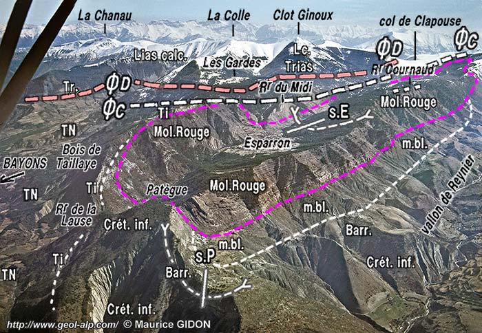 Cette torsion, dans le sens anti-horaire, de l'axe du pli se montre liée à l'existence à cette latitude, d'un autre pli, le synclinal du Patègue, qui affectait déjà les couches jurassiques et crétacées antérieurement au dépôt de la Molasse Rouge (en effet les couches de cette dernière s'appuient en onlap contre son flanc : voir, à la page "Reynier", des compléments à ce sujet). Ce pli, dont l'axe est orienté presque E-W, a été repris par le plissement post-oligocène, qu'il a dû guider et qui en a accentué le serrage ; il se poursuit vers l'ouest par le synclinal du Saint-Amand, qui traverse la dépression des Graves au nord de Clamensane avant de buter contre la faille N-S de Vermeil. |