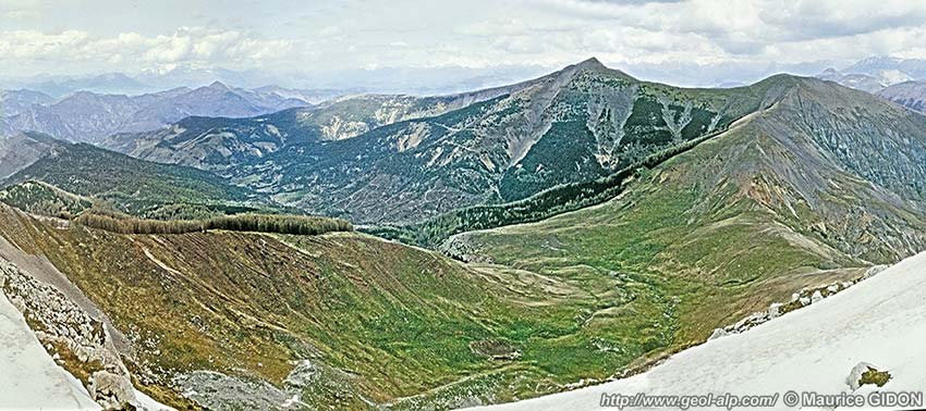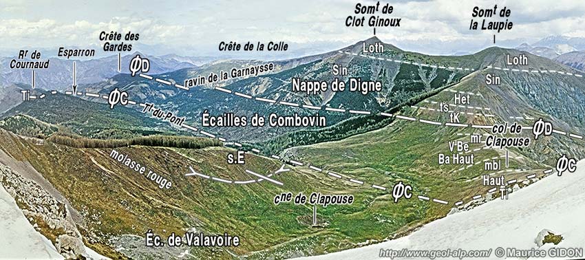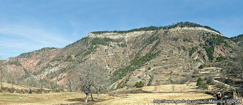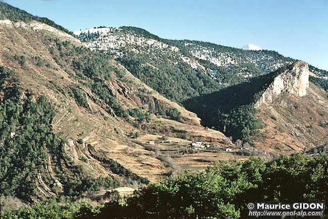 En amont du hameau du Pont c'est la nappe de Digne qui constitue l'essentiel des hautes pentes de rive droite du vallon, qui culminent à La Colle de l'Oratoire. La base du matériel de la nappe (ici riche en dolomies du Trias moyen) repose sur des lames de Jurassique supérieur entraînées tectoniquement, les "écailles de Combovin" : elles ont été arrachées à la voûte de l'aire anticlinale dont les Terres Noires de Bayons représentent le coeur (voir la page "Bayons").