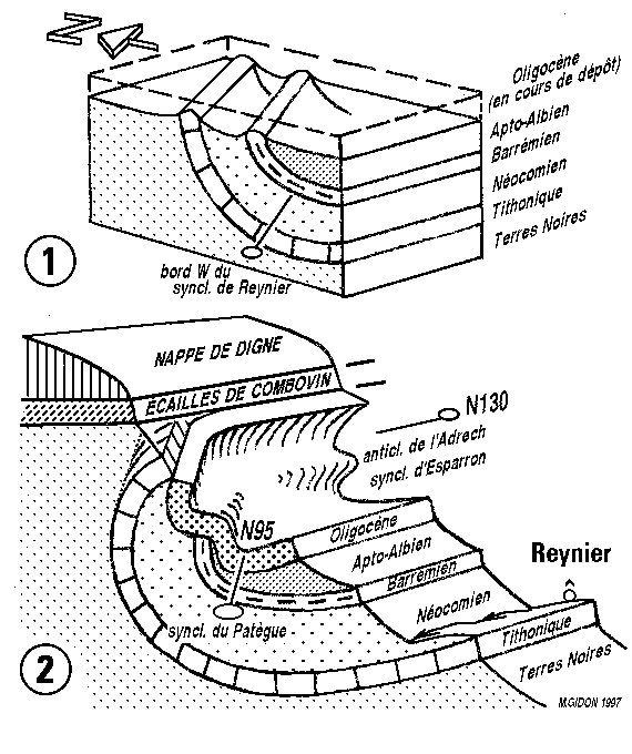 dont les effets se sont superposés. Le synclinal du Patègue représente une zone de torsion de l'axe du synclinal post-Oligocène d'Esparron. Cette torsion a été induite "d'en dessous", par la présence de la charnière synclinale du bord ouest du synclinal de Reynier. Cette charnière anté-Oligocène a été basculée et sans doute réactivée par le plissement post-Oligocène. |