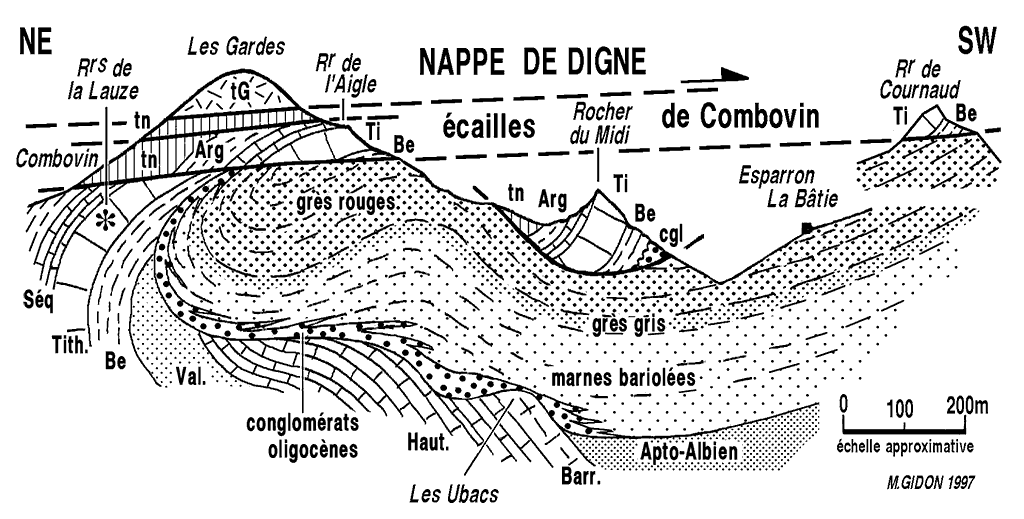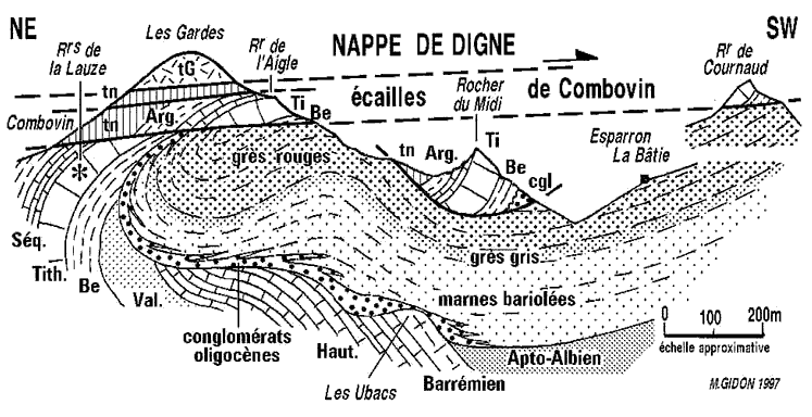 ![]() Coupe du synclinal d'Esparron Ce schéma synthétique, regroupe les données de plusieurs transversales. Il est extrapolé en profondeur à partir des coupes naturelles observables plus au nord (c'est ainsi que le lieu-dit Les Ubacs ne se trouve pas sur le tracé de la coupe, mais plus au NW, sur l'échine orientale du Patègue). Deux klippes* comportant du matériel d'âge Jurassique supérieur - Crétacé inférieur reposent sur l'Oligocène et se rattachent vraisemblablement au système des écailles de Combovin. Celle du Rocher du Midi est logée au coeur du synclinal principal et sa surface de chevauchement a été ployée avec la Molasse Rouge sur laquelle elle repose. Celle du Rocher de Cournaud recoupe au contraire le flanc ouest du synclinal d'Esparron et sa surface de charriage semble avoir une attitude parallèle à celle de la nappe de Digne. (pour plus de commentaires se reporter à la publication n°183) |