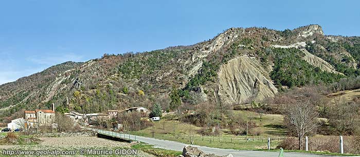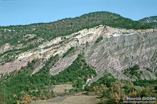- en rive gauche affleurent dans tout le versant, jusqu'aux crêtes, les couches tertiaires gréso-argileuses grises ou rouges de l'autochtone de cette nappe, lesquelles sont d'ailleurs imbriquées par les chevauchements des écailles de Faucon.