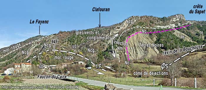 En rive gauche (sud-orientale) du Grand Vallon on voit, à la latitude de Faucon-du-Caire, que les couches tertiaires sont séparées en deux ensembles par une bande de Terres Noires qui affleure en rive droite du ravin de la Bouchouse. Ces Terres Noires représentent la base de l'écaille du Sapet qui se prolonge vers le SE au dessus de sa surface de chevauchement qui suit pratiquement le fond du ravin : cette unité tectonique repose sur un autochtone qui forme les collines de rive gauche (SW) du ravin (Villaron, Pré de Dame) jusqu'au col de la Chatonnerie, au pied sud du sommet du Sapet.