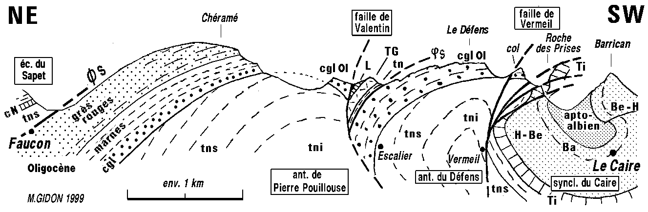 ![]() Coupe de la rive gauche (sud-orientale) du Grand Vallon, entre Faucon et Le Caire (localisation sur la carte en fin de page) ØS = surface de chevauchement de l'écaille du Sapet (on la retrouve, abaissée par la faille de Valentin, dans le compartiment du Défens). Cette coupe, parallèle à la vallée, est perpendiculaire aux plis NW-SE post-oligocènes ; mais elle est complètement transversale par rapport au mouvement de mise en place de l'écaille du Sapet et son tracé passe presque le long de la crête de partage des eaux entre Vermeil et Grand Vallon, où il n'est que faiblement oblique à celui de la faille occidentale de Vermeil. De ce fait la manière dont cette dernière interfère avec les plis n'a pu y être représentée que de façon très schématique : on trouvera en fin de page une représentation plus fidèle de la géométrie complexe qui en résulte au niveau de La Roche dans le versant de rive gauche du Grand Vallon. |